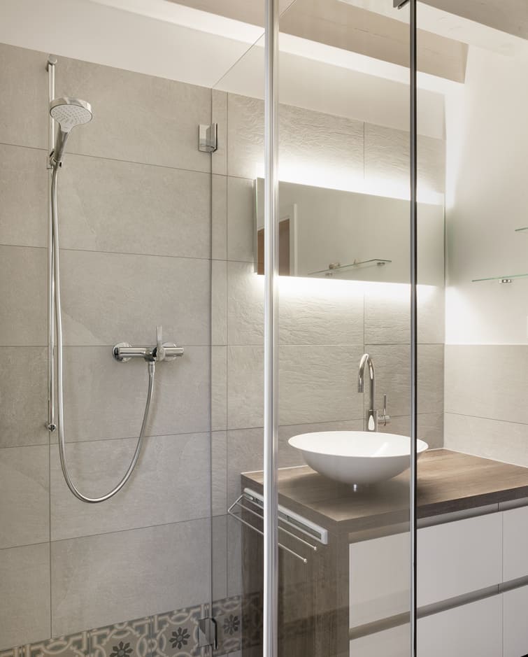 Dank unserer Erfahrung kennen wir die Möglichkeiten, den oft knappen Raum in einem Badezimmer perfekt zu nutzen; kennen die Methoden und Techniken um auch bei kleinen Fenstern Ihr Bad wirkungsvoll aufzuhellen. Die Verwendung der richtigen Materialien ist, zur Vermeidung von Kalkansatz, in einer solchen Nasszelle zwingend; da sind wir konsequent. Auch wird dadurch das Reinigen erleichtert.